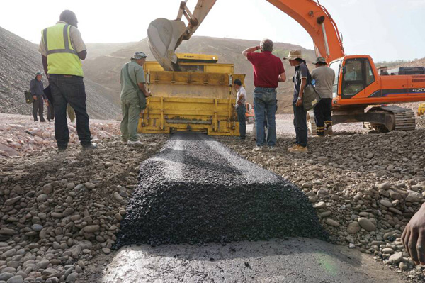 埃塞俄比亞旱季熾熱的風撲打著人們的面龐,也映襯了瀝青混凝土芯墻現場火熱的施工場景。自從2015年3月6日簽訂合同以來,Wolkite瀝青混凝土項目施工緊鑼密鼓,在進行了大量實驗和前期準備的基礎上,取得了實質性進展,截止5月15日已完成從804m高程至816m高程的填筑,余下工作正有序進行。