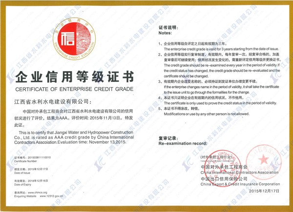 根據商務部、國資委聯合發布的《商會協會行業信用建設工作指導意見》和《關于進一步做好行業信用評價工作的意見》的要求,結合承包商會關于推進行業信用體系建設的工作部署,承包商會于2015年7月啟動2015年度對外承包工程企業與勞務合作企業信用等級評價工作,經對外承包工程企業與勞務合作企業信用等級評審委員會第十一次工作會議審議,江西省水利水電建設有限公司被評定為2015年度對外承包工程企業信用評價AAA級信用企業。