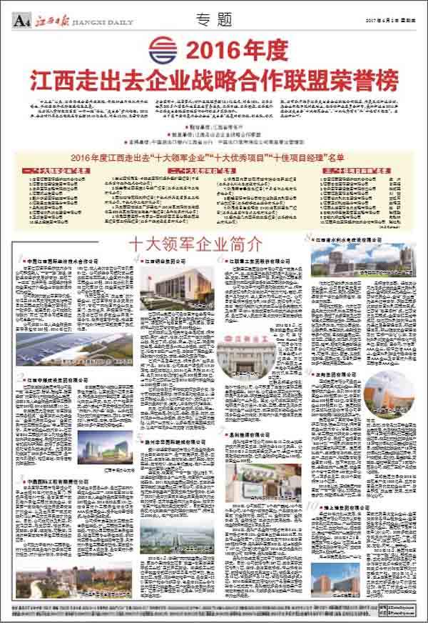 6月3日,江西走出去企業(yè)戰(zhàn)略合作聯(lián)盟2017年大會在南昌召開。省委常委、常務副省長毛偉明出席大會并作重要講話,會上省委常委、常務副省長毛偉明、省政府秘書長王亞聯(lián)和省商務廳廳長王水平分別為2016年度全省走出去“十大領軍企業(yè)”、“十大優(yōu)秀項目”和“十佳項目經(jīng)理”授牌。江西走出去企業(yè)戰(zhàn)略合作聯(lián)盟輪值主席、中國江西國際經(jīng)濟技術合作公司總經(jīng)理徐國建報告了2016年工作,國家開發(fā)銀行江西分行、中國進出口銀行江西省分行和中國出口信用保險公司南昌營管部作為聯(lián)盟副主席單位發(fā)言。公司董事長王元旦作為十大優(yōu)秀項目的企業(yè)代表發(fā)言。《江西日報》、《江西衛(wèi)視》相繼對大會進行了大幅報道。