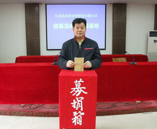 2010年4月14日,青海省玉樹縣發生兩次地震,最高震級7.1級,造成了當地巨大的人身傷亡和財產損失,“玉樹地震”牽動著億萬人民的心,也牽動著我司所有員工的心!公司在全司范圍內積極開展“情系玉樹募捐活動”,4月26日,我公司南昌市機關總部首先開展了“情系玉樹募捐活動”,公司中層以上管理人員和員工踴躍參與募捐活動,紛紛獻上自己的一份愛心,體現出江西水總人的社會責任感!同時,各分公司、國內外施工項目部也在開展此項活動,預計此項活動將募得資金3萬余元。