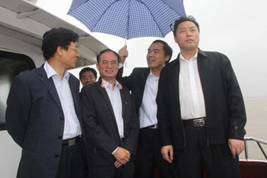 楊丕龍副廳長等冒雨登上快艇甲板察看固岸應(yīng)急度汛工程