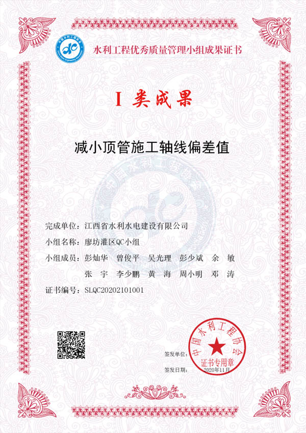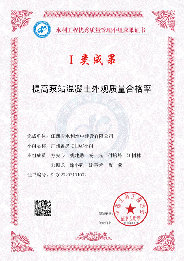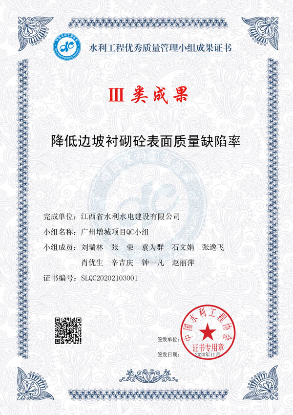 其中:廖坊灌區QC小組編寫的《減小頂管施工軸線偏差值》獲I類成果獎、廣州番禺項目QC小組編寫的《提高泵站混凝土外觀質量合格率》獲I類成果獎、廣州增城項目QC小組編寫的《降低邊坡襯砌砼表面質量缺陷率》獲III類成果獎。