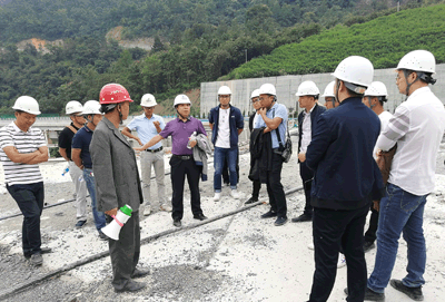 第二站,學習團來到新屯水庫,跟隨著項目管理團隊參觀了導流隧洞、上壩公路、主壩施工區、進水塔、溢洪道、沉降觀測室、料場、復建公路等施工區域,隨后由項目副經理向國華、測量負責人鄒國群及質量負責人廖軼先分別就各自負責的工作內容向學員們進行了現場授課。通過現場學習,學員們了解到該工程七大特點。