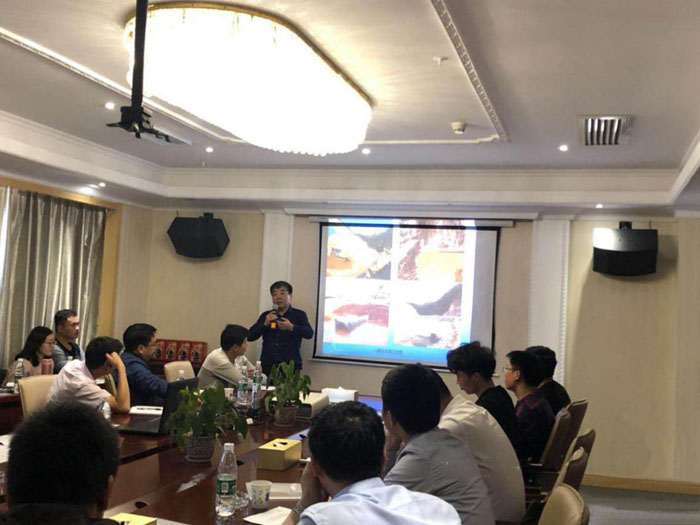 現場參觀結束后,學習團參加了技術培訓和經驗交流會??偨浝碇矶帕柚鞒至碎_班儀式??偣こ處熀櫥?、項目副經理李成,對洋前壩水庫的大壩總布置、大壩施工導流、大壩及供水管道施工技術細節等,通過文字、圖片、視頻等組成的PPT課件為學員授課,并就學員提出的問題逐一進行了解答。