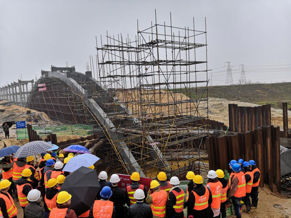 首日,學(xué)習(xí)團(tuán)冒著寒風(fēng)和細(xì)雨,先后參觀(guān)了西干渠三區(qū)地下頂管技術(shù)現(xiàn)場(chǎng)、渡王家渡拱式渡槽技術(shù)現(xiàn)場(chǎng),一分干渠曾家渡碗式渡槽完工段。彭燦華、曾俊平、馬小毛等項(xiàng)目管理人員,先后就技術(shù)特點(diǎn)、質(zhì)量安全控制要點(diǎn)、技術(shù)方案比選、經(jīng)濟(jì)效益分析等,向?qū)W習(xí)團(tuán)一行作了介紹。