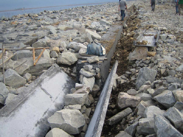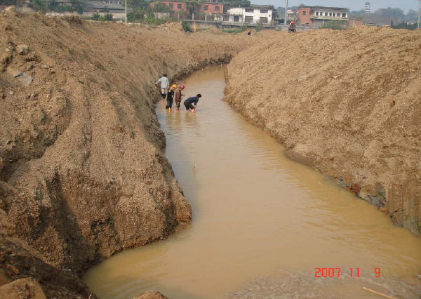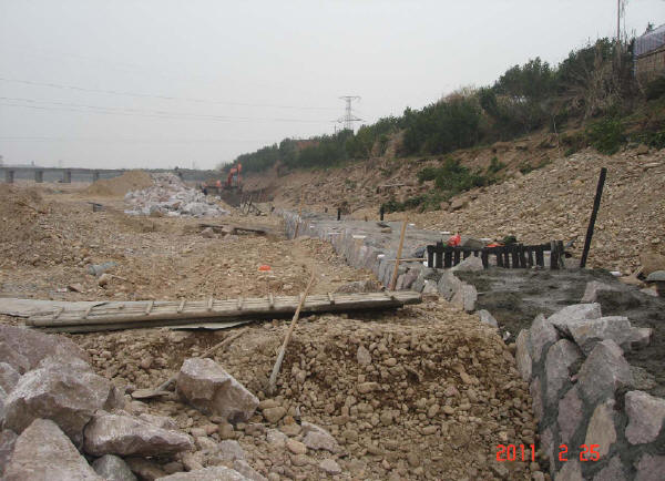 堤基清理:必須對堤內(nèi)、外坡腳線外1m范圍內(nèi)的亂石、墳?zāi)埂⒏鞣N建筑物和垃圾、雜草、樹木、樹根、腐植土及淤泥全部清除,并棄至背水坡腳以外或指定場地,水井、泉眼、洞穴等按設(shè)計要求處理,并經(jīng)驗收確認合格為止。