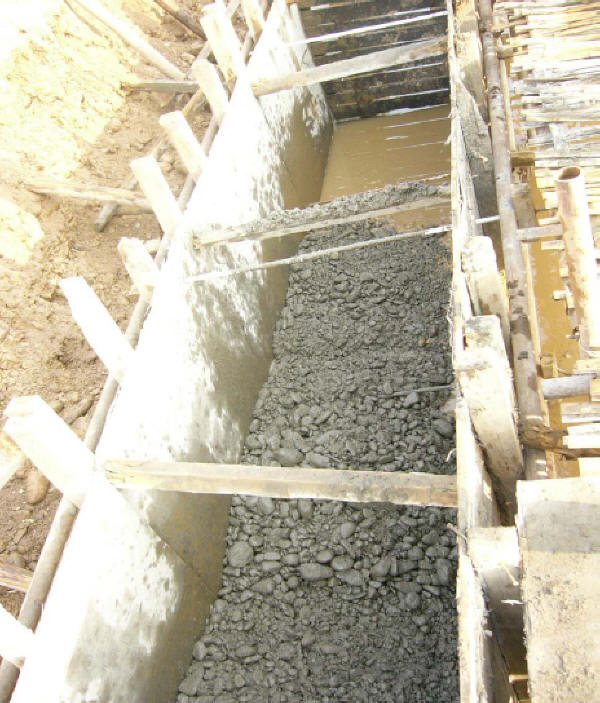 基坑開挖:驗收前,施工單位應(yīng)對地下水或地表水作妥善引排或封堵,清理積渣雜物,作好高程、軸線的測量復核、記錄,并設(shè)樁拉線。驗收合格后,方可安排砌石或澆筑混凝土。